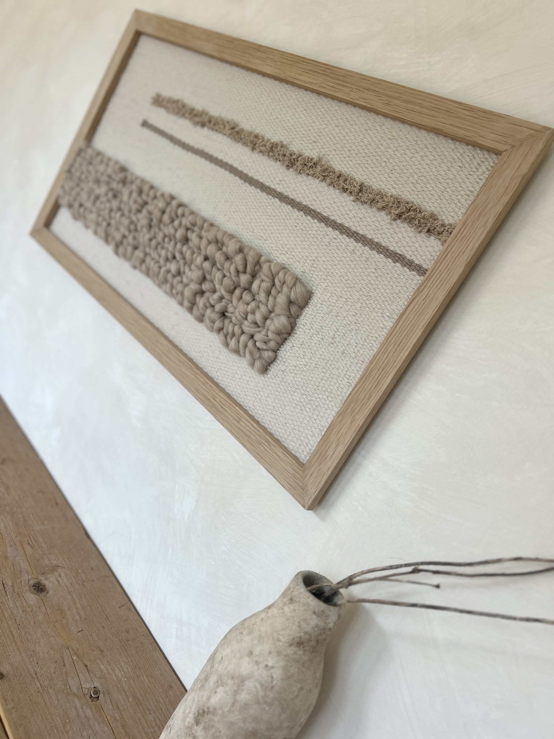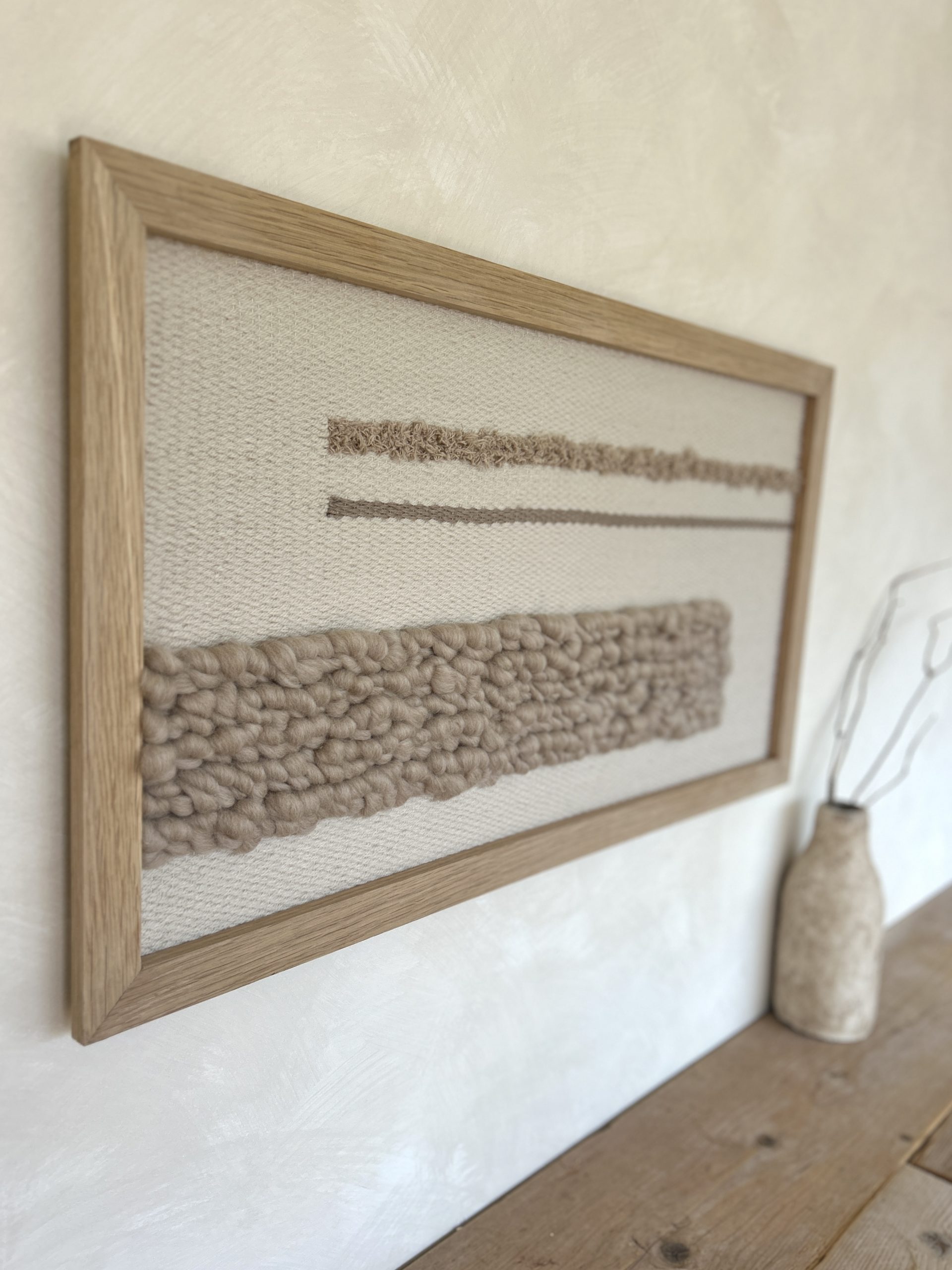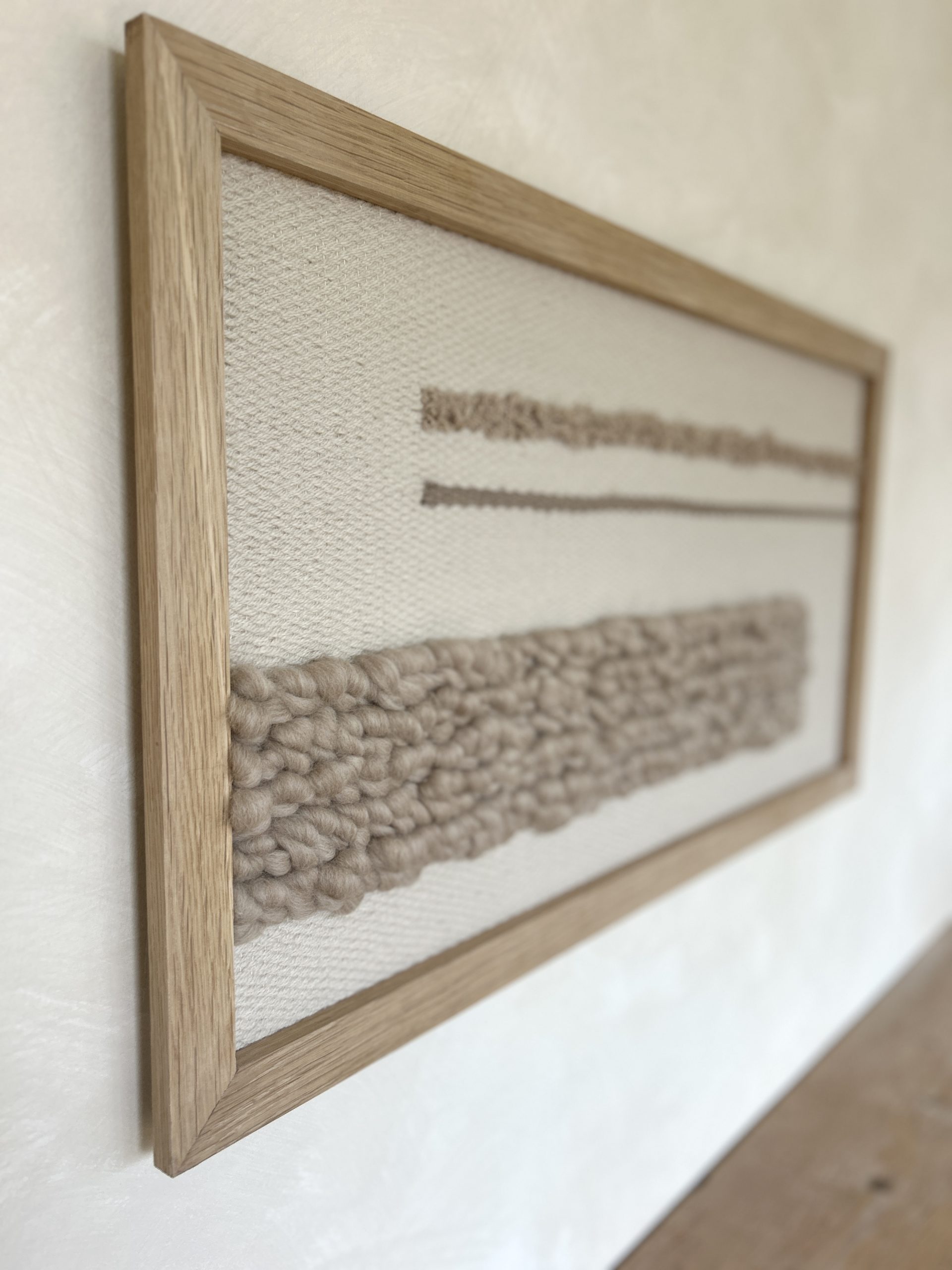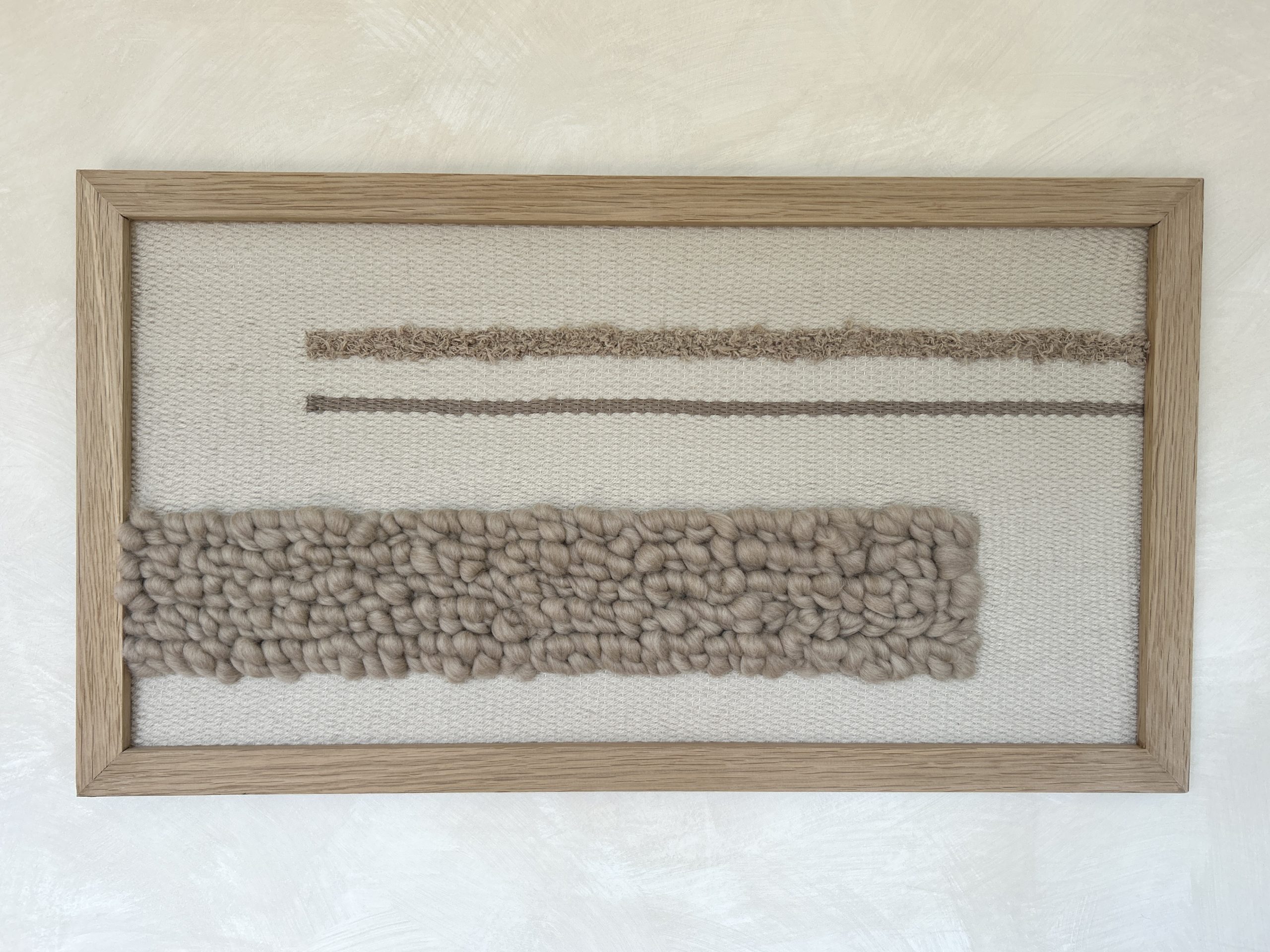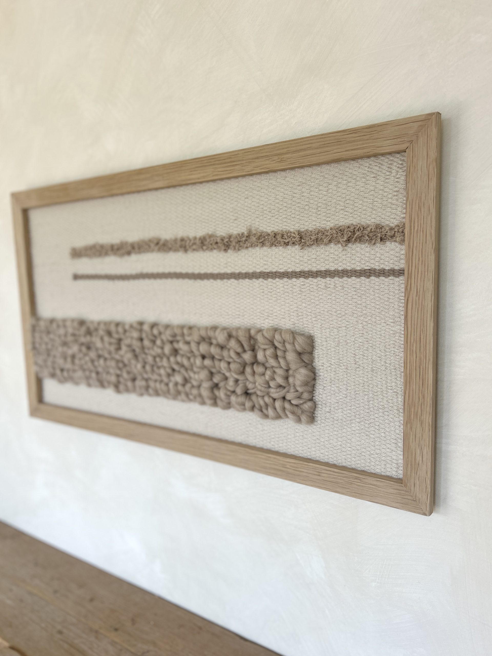 unique hand woven wall hanging in a solid oak frame, with taupe bobble texture and linear detailing