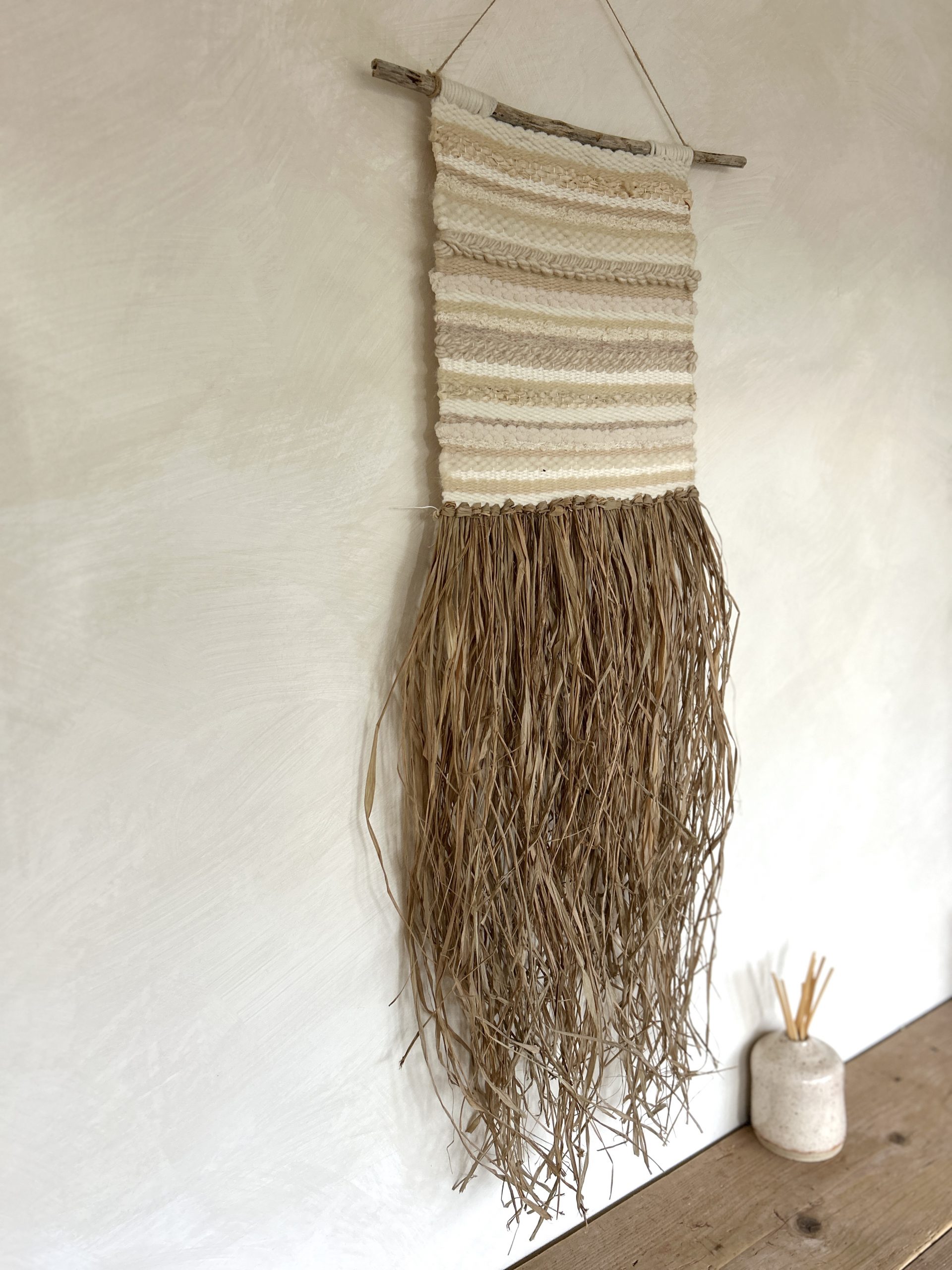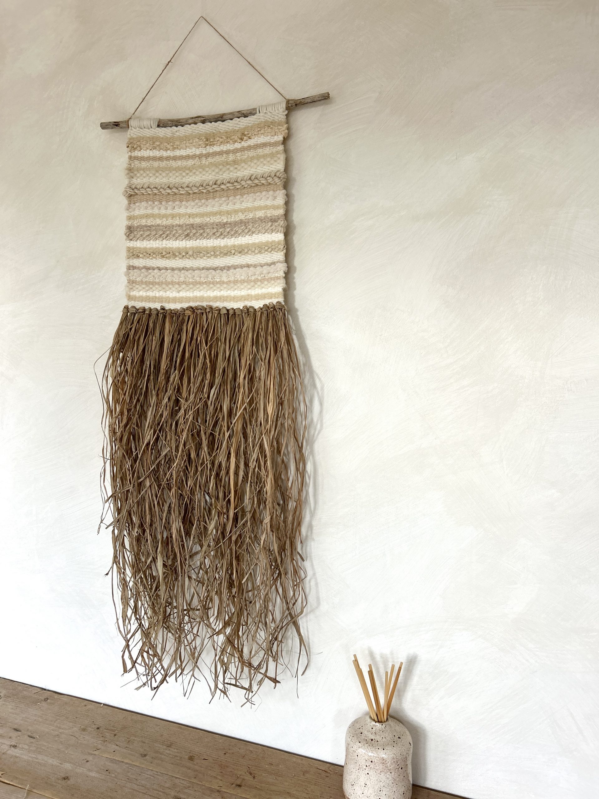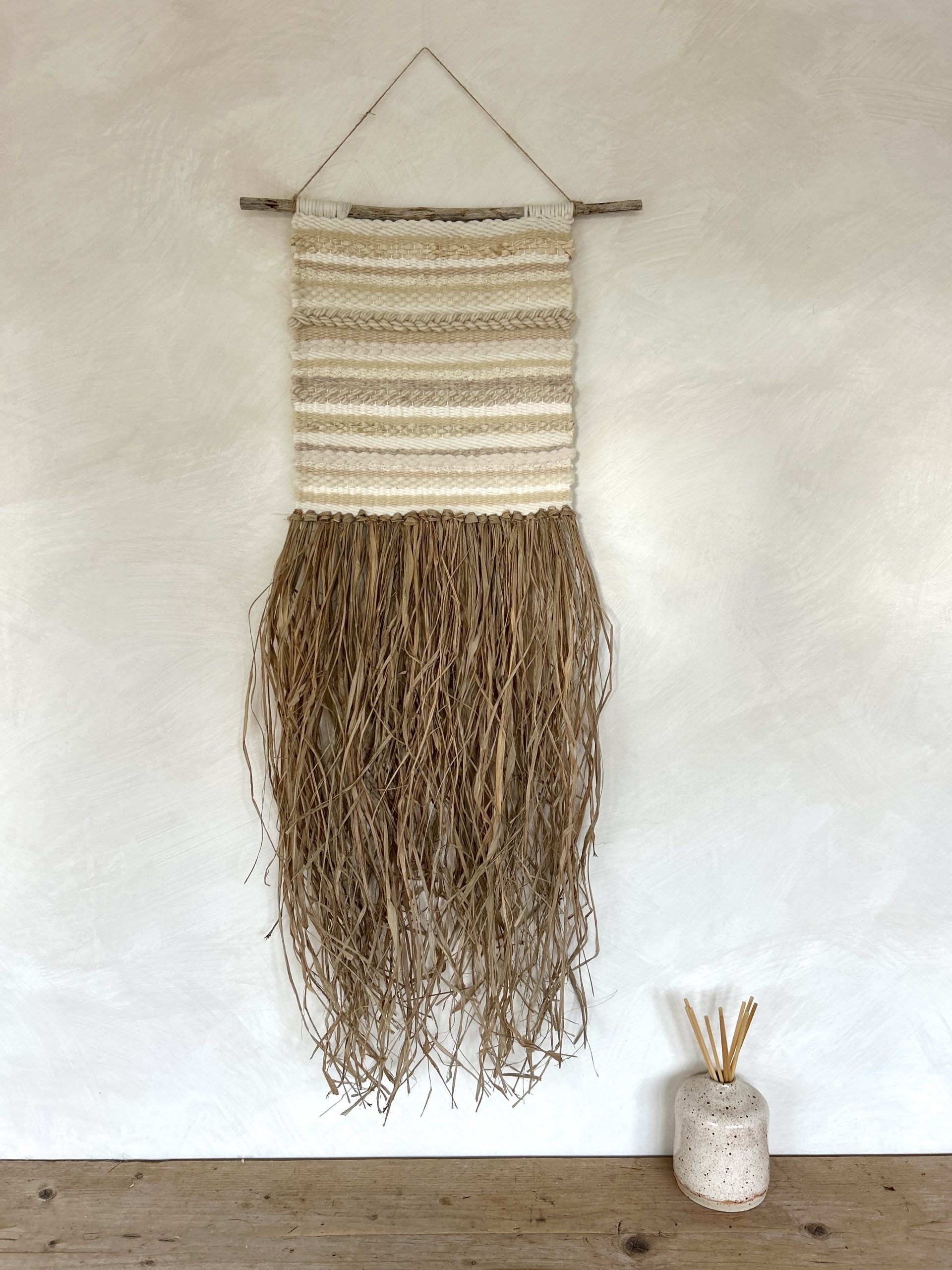 unique hand woven wall hanging using raffia fringing and cream woven textures