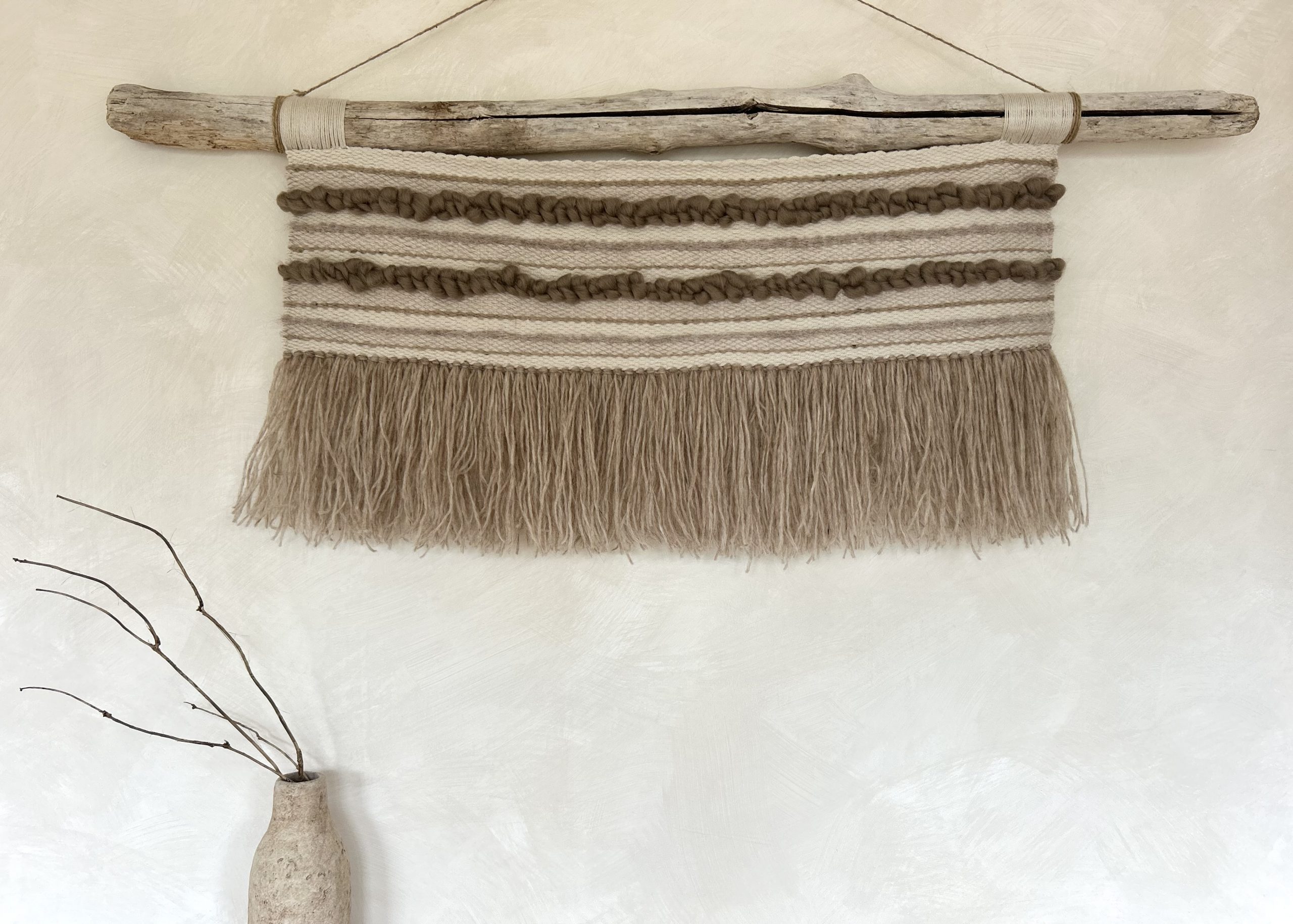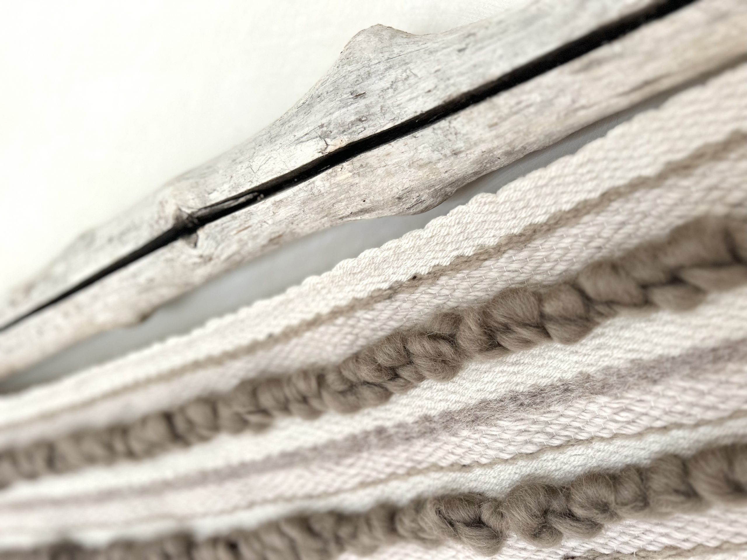 hand woven wall hanging using a palette of taupe and griege wools, with bobble texture detailing, hung on a beautifully unique piece of driftwood