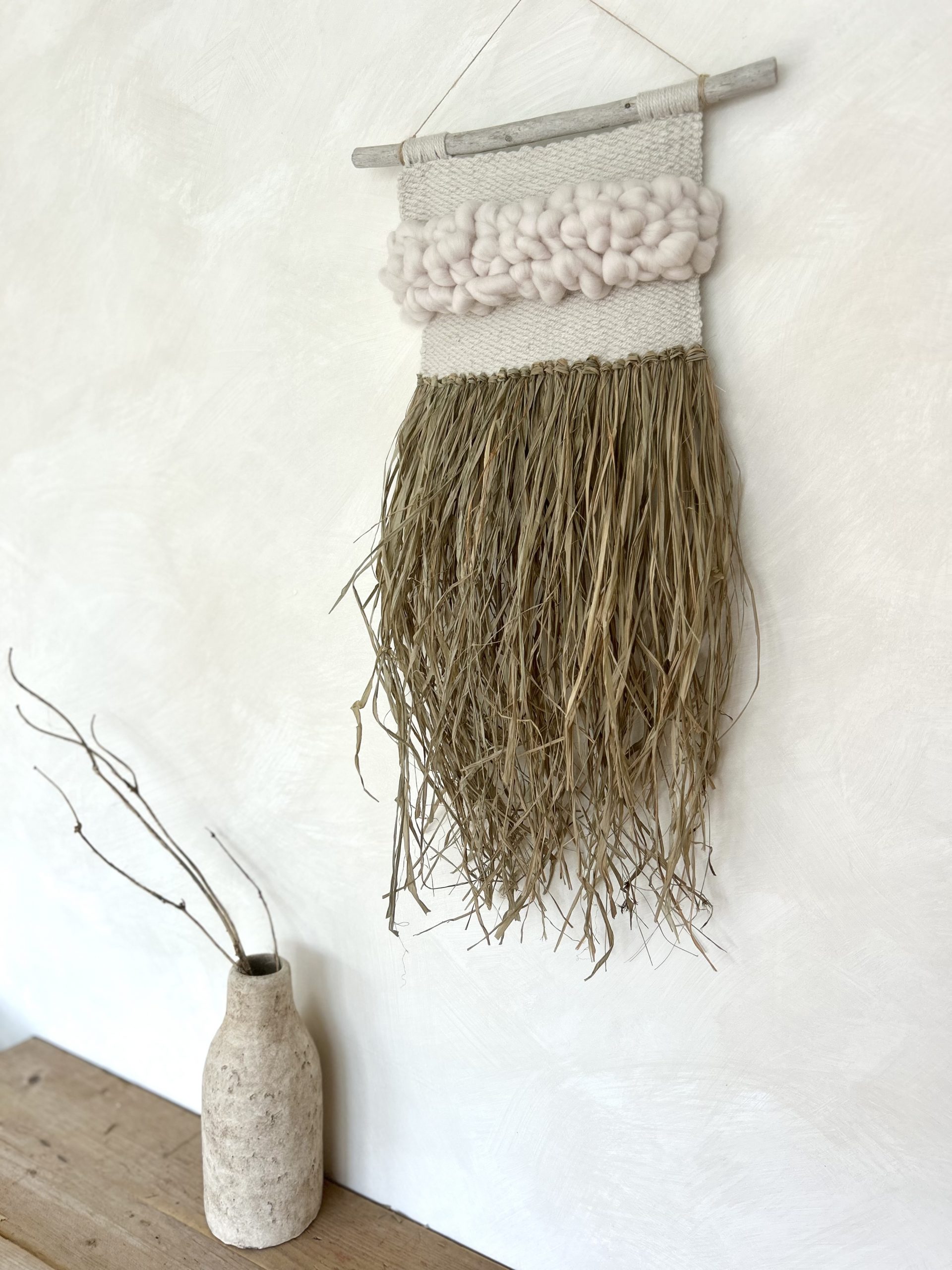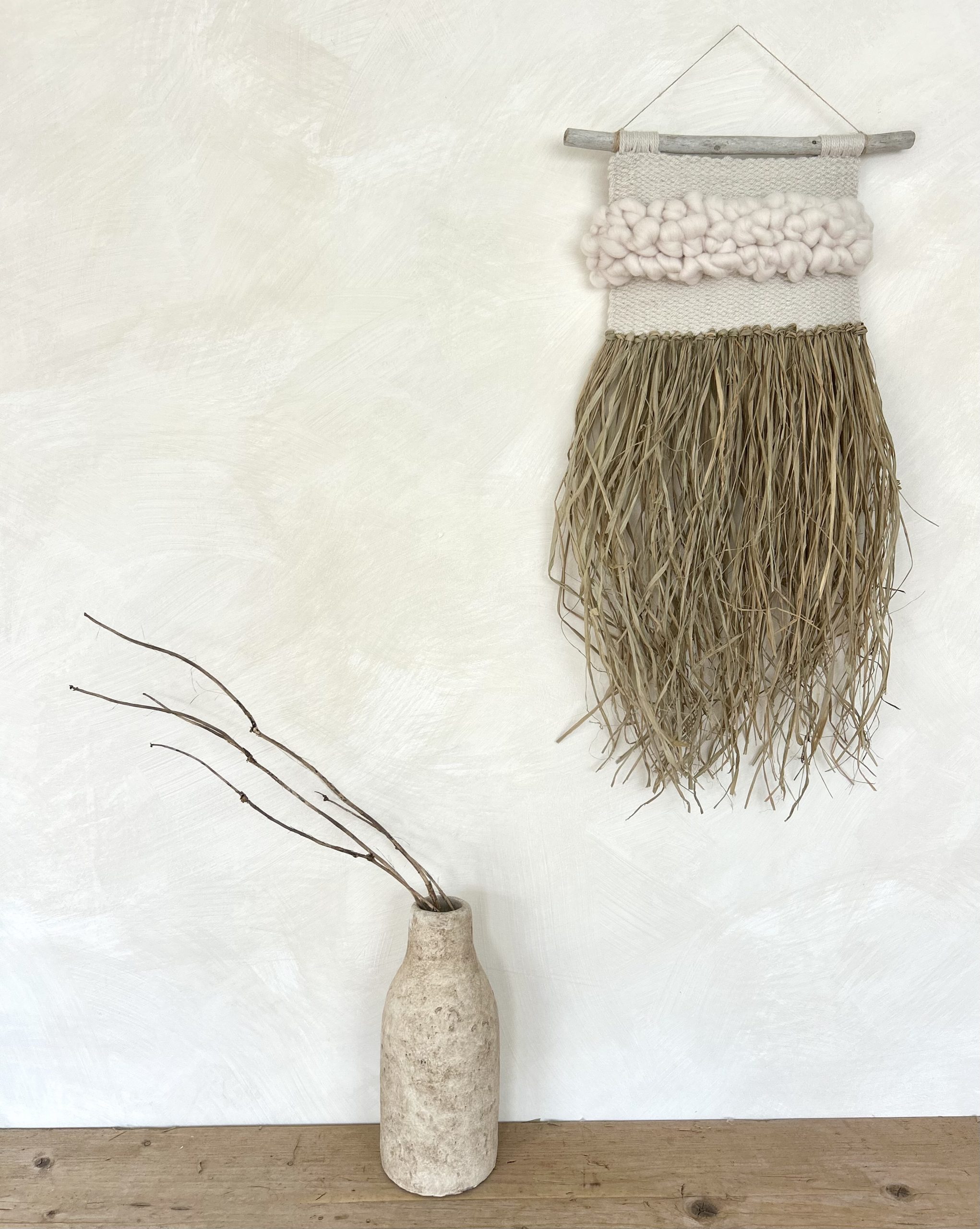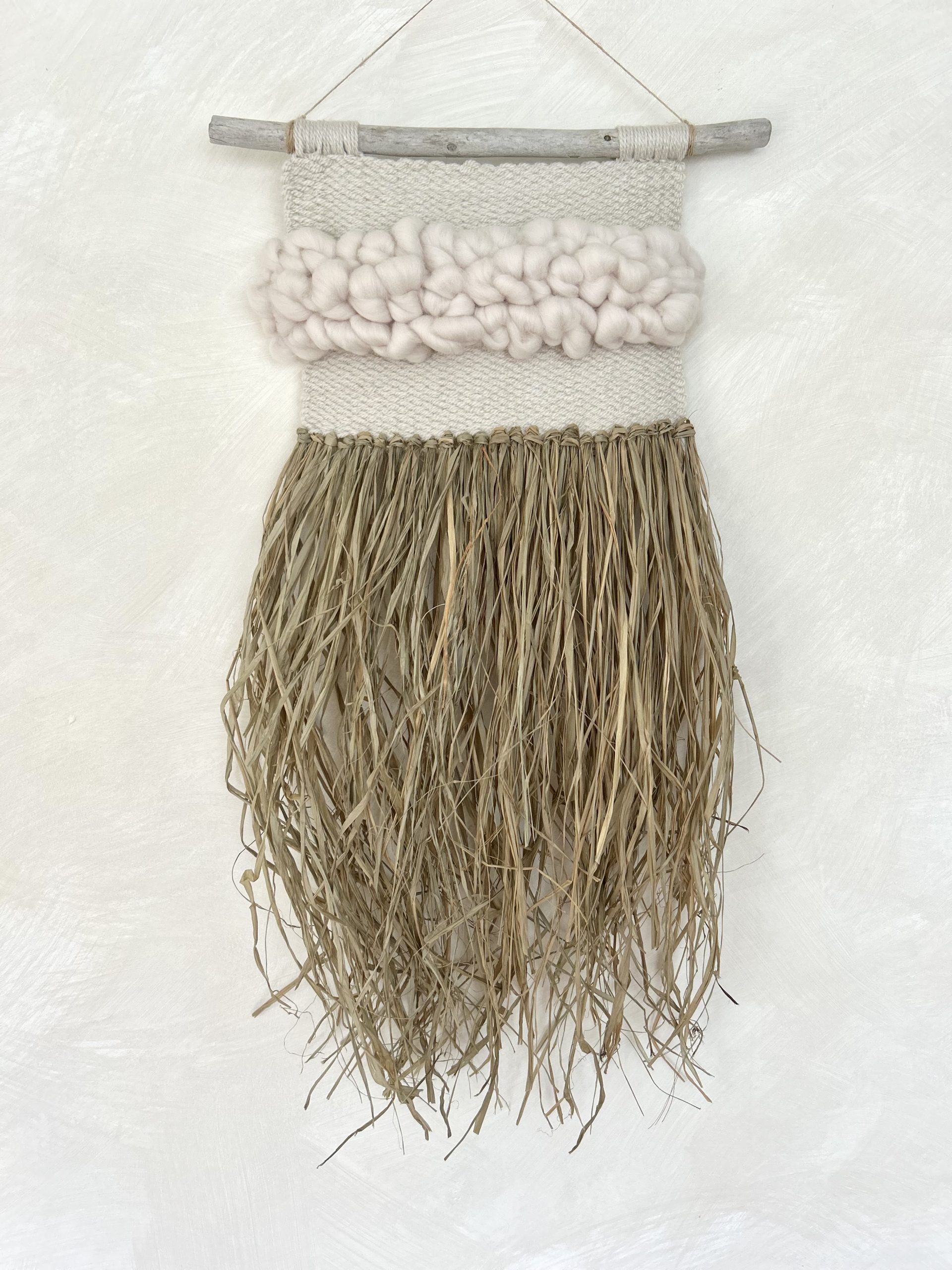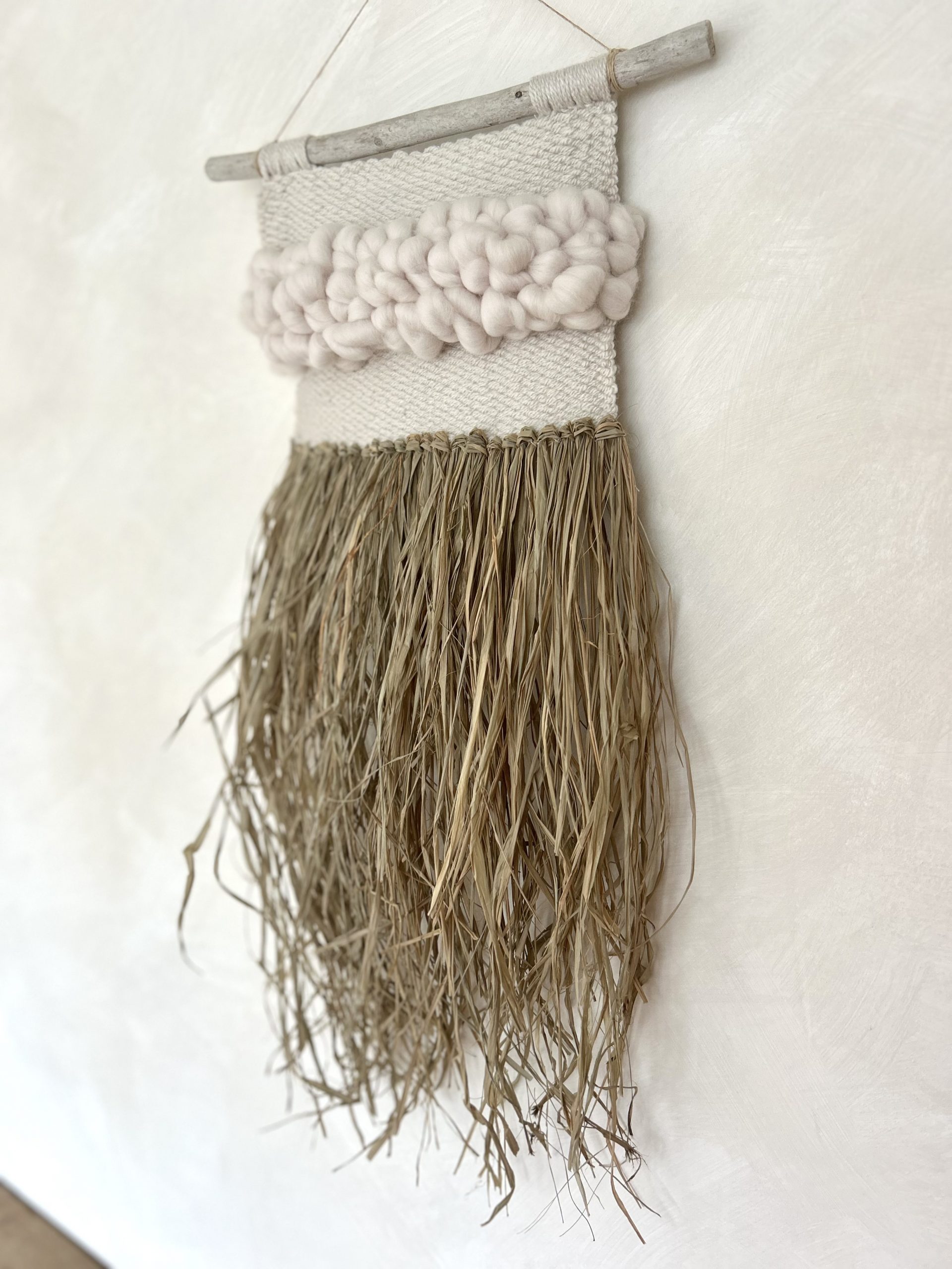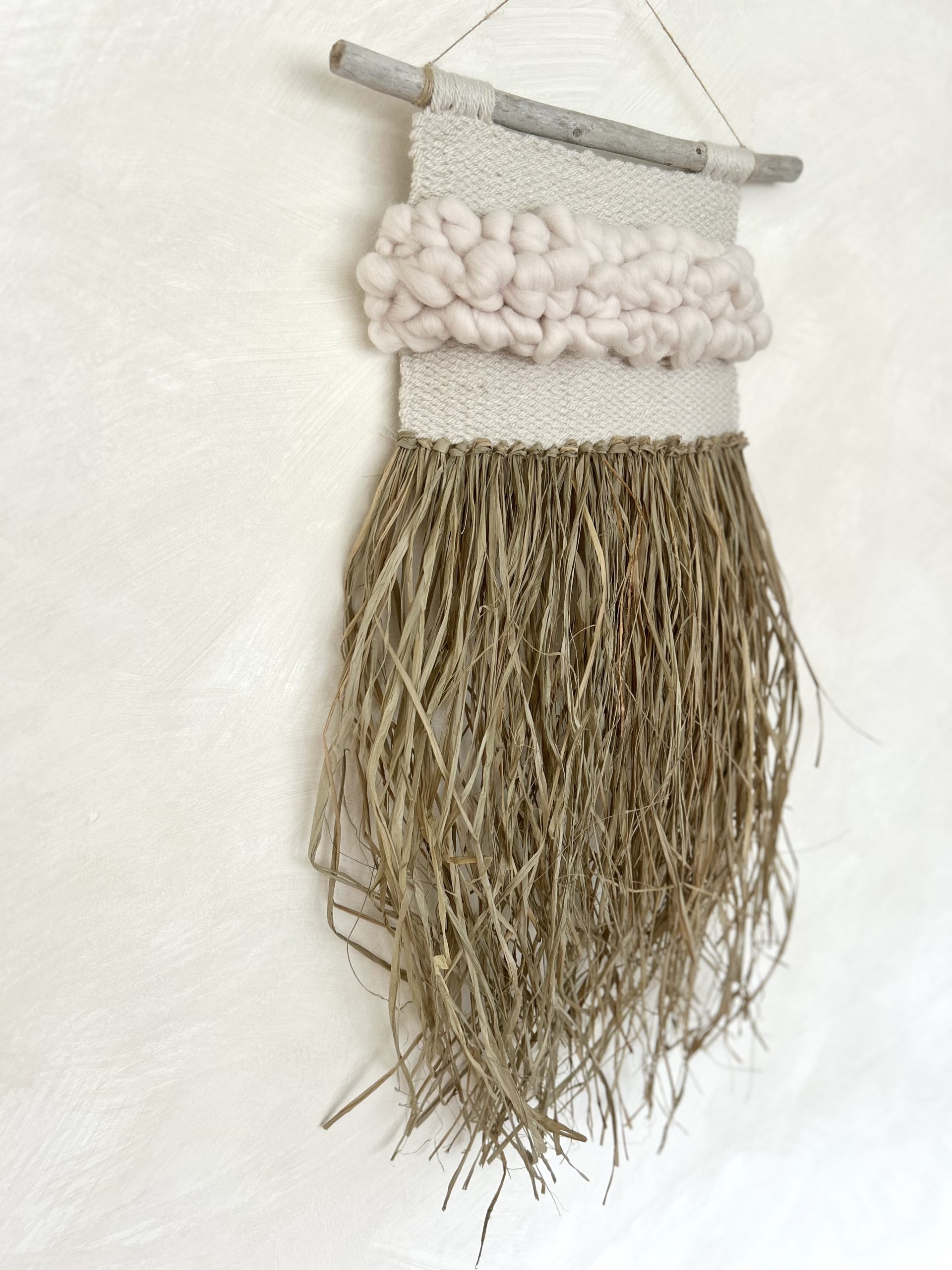 unique hand woven wall hanging using raffia fringing, and oyster merino wool textured bobble detailing, hung on driftwood