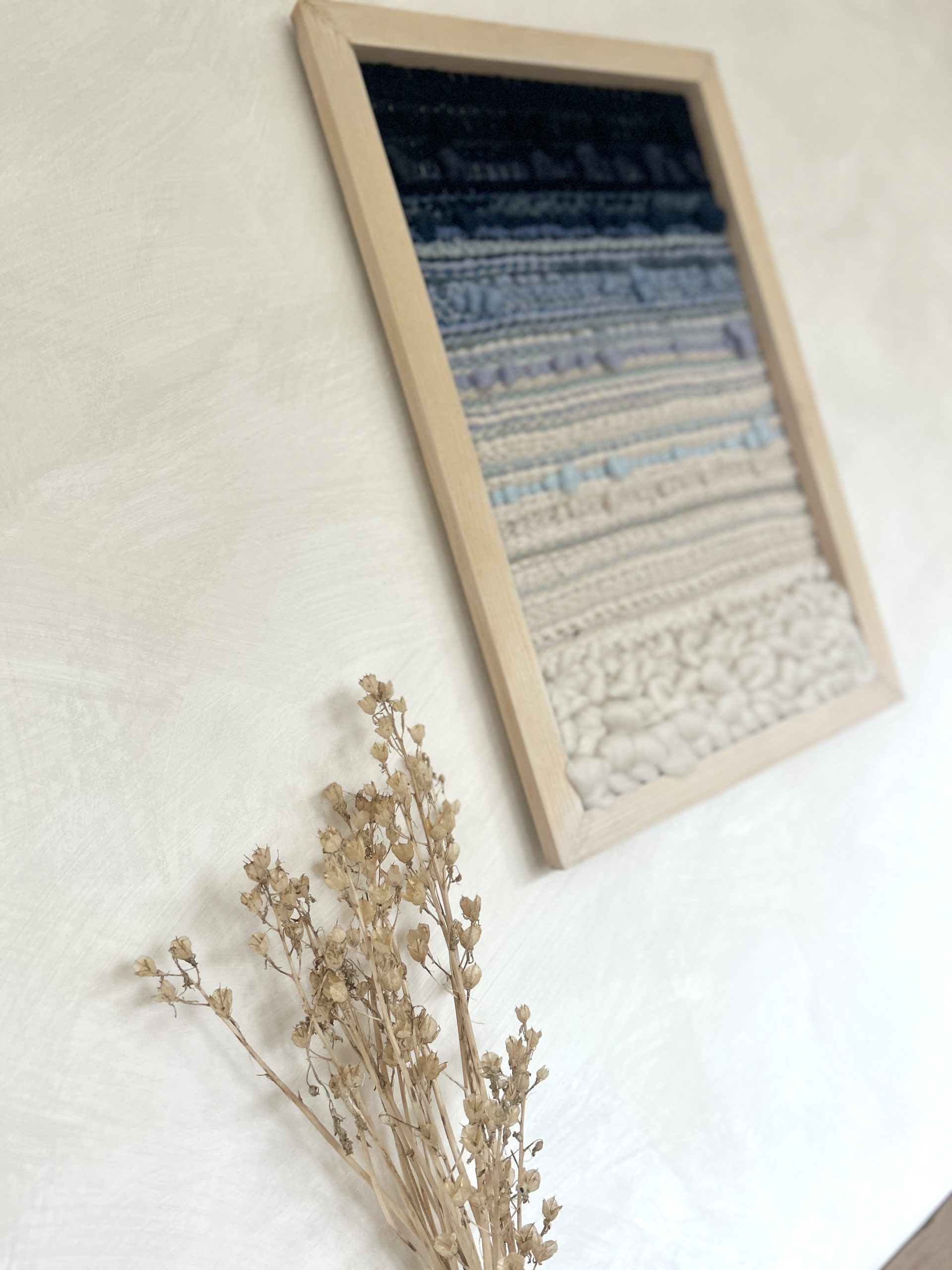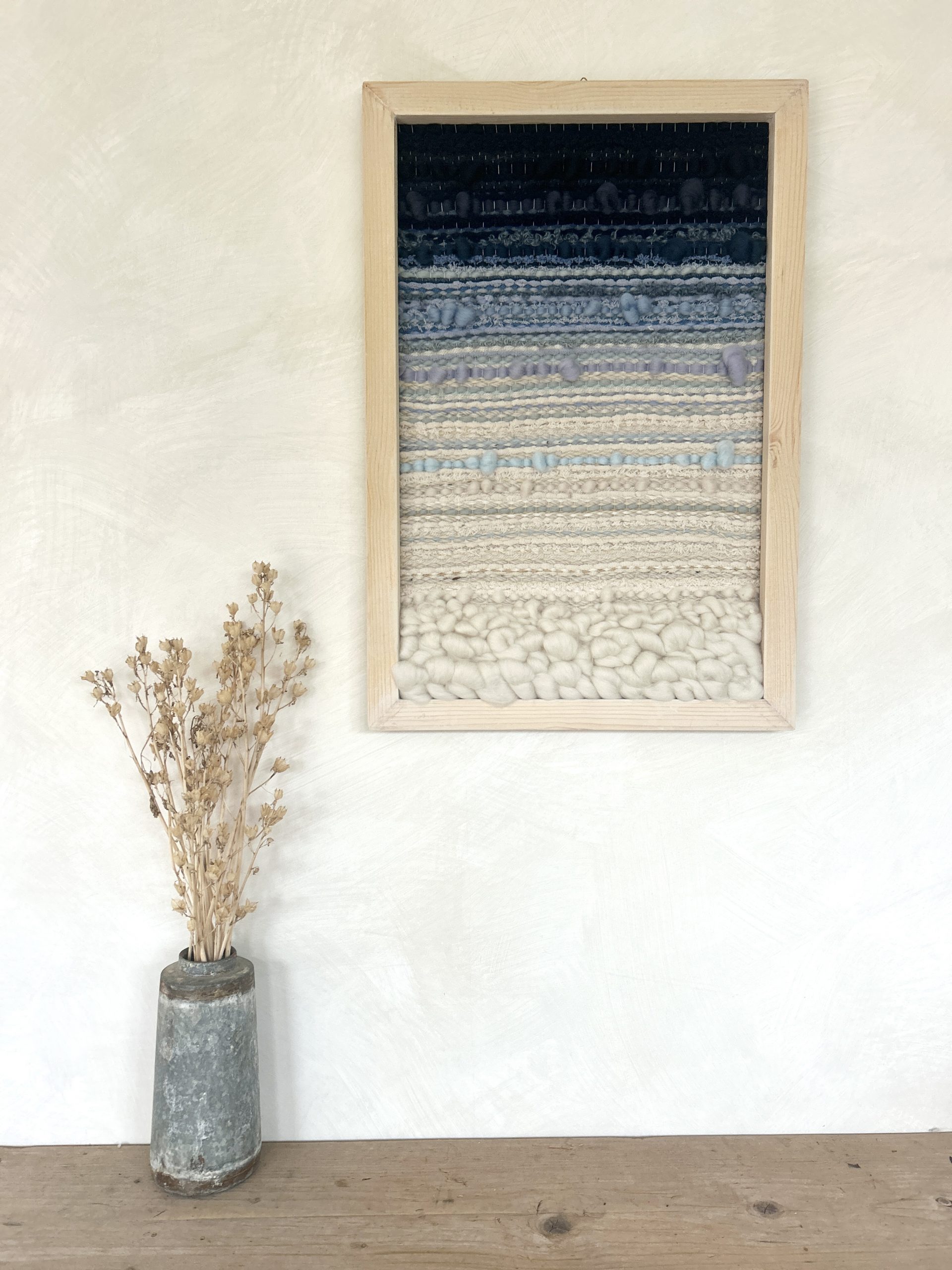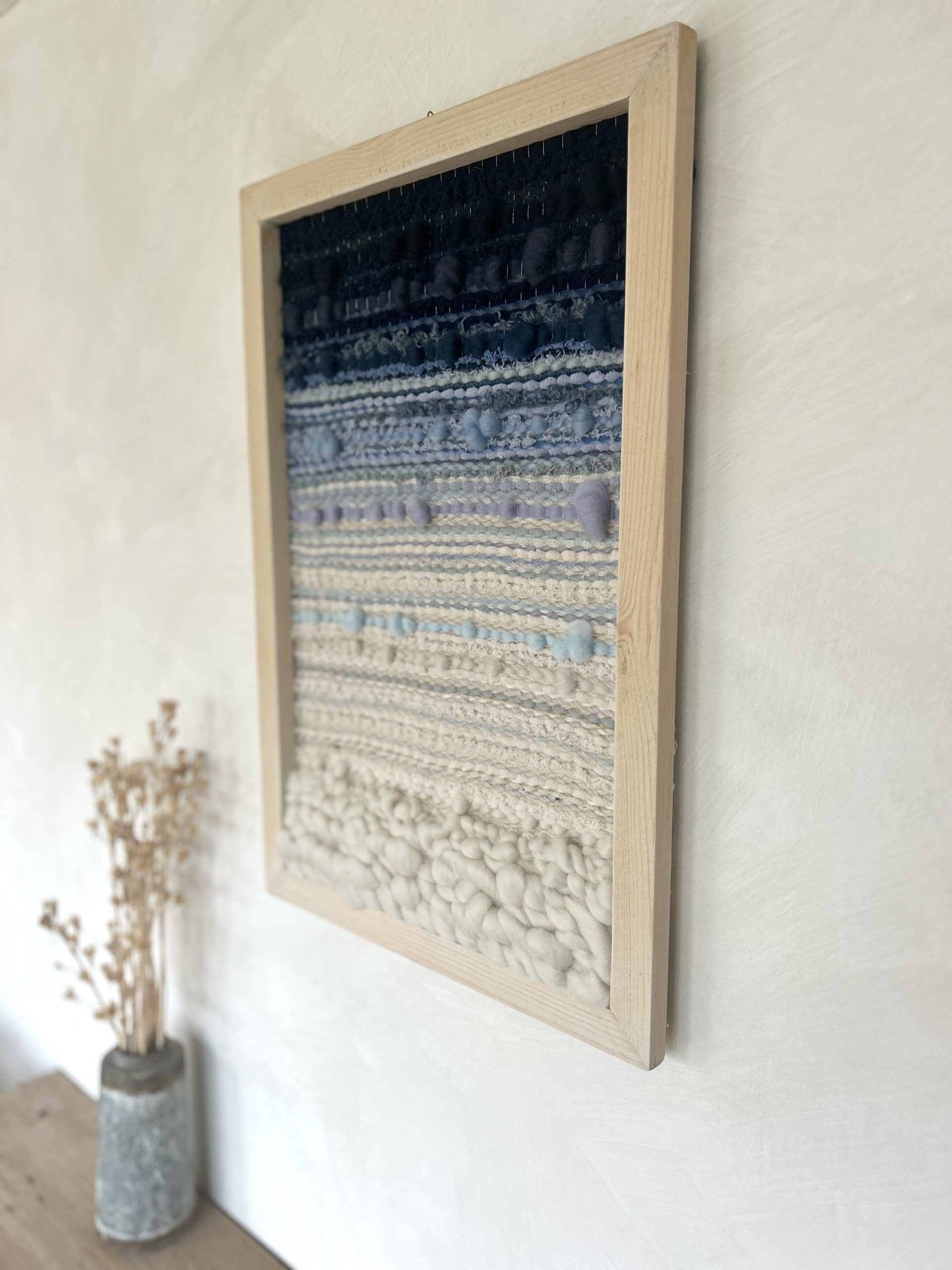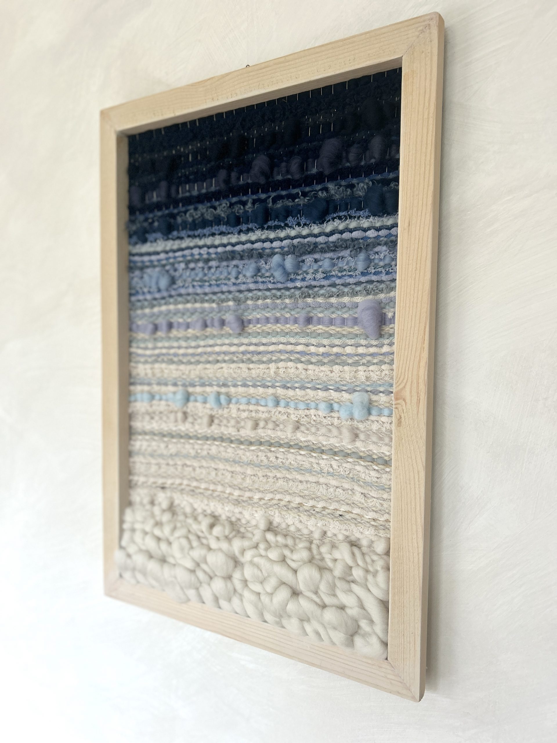 unique hand woven wall hanging inspired by the ocean, using a white wash wood frame and ocean blue ombre textures