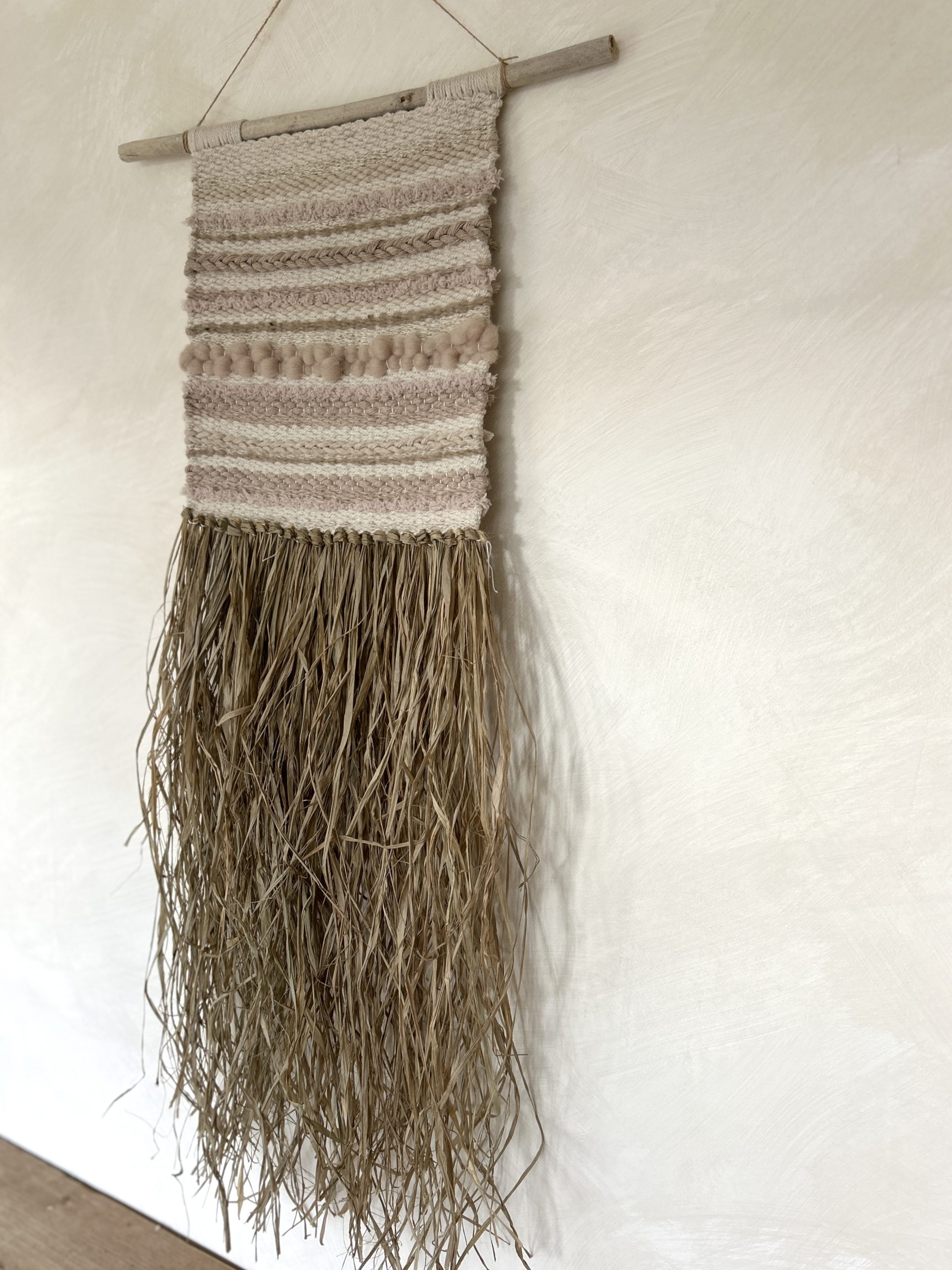 unique hand woven wall hanging using raffia fringing and taupe woven textures